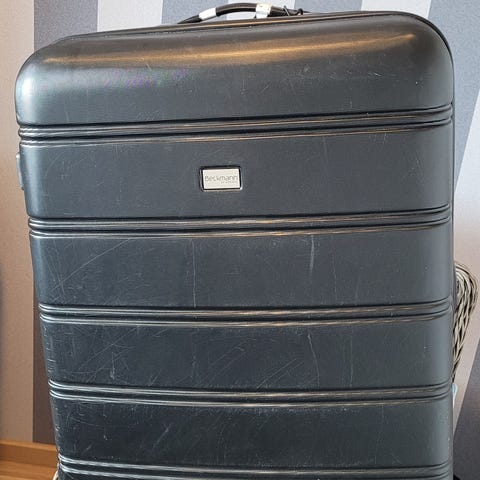 Solid og diger koffert i hardplast selges. Pent brukt - har noen overfladiske skrammer, men ingen alvorlige.