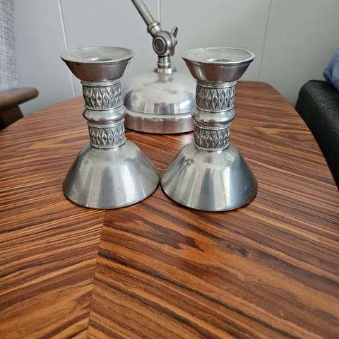 De er 17cm høye, nedre dia 13cm, øvre dia 10,5cm. De er merket tinn 56.