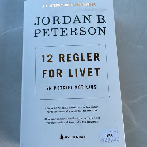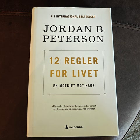 Selger boka “12 regler for livet – En motgift mot kaos” av Jordan B. Peterson. Norsk utgave, utgitt av Gyldendal.
