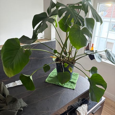 Monstera plante pottet om i fjor vår, og trenger nok en ny ompotting snart. Er meget lette og holde og kommer stadig med nye blader. Spesielt etter ompotting.
