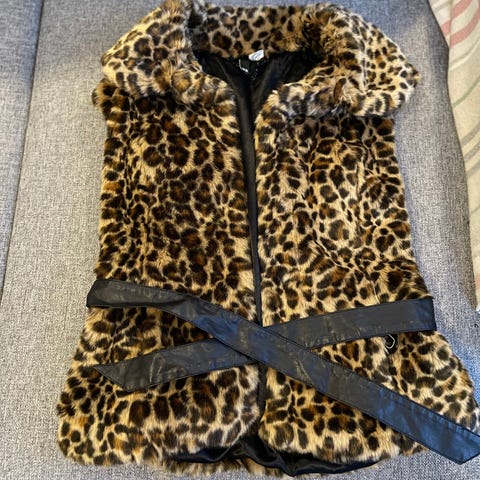 Fin, koselig og lekker vest med glidelås og tre lommer (to på utsiden og en på innsiden). Offwhite farge på utside, og myk og behagelig til kroppen kunstig pels med leopard farge er på underlaget. Størrelsen er 36-38 (S-M).