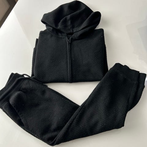 Grått sett med joggebukse og jakke med glidelås i størrelse 110. Myk innside.