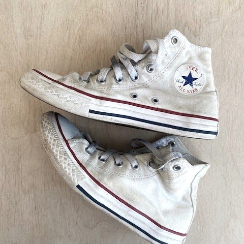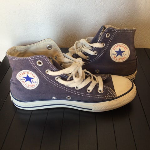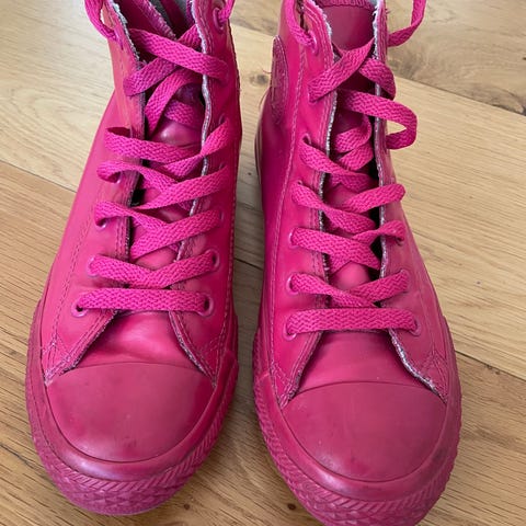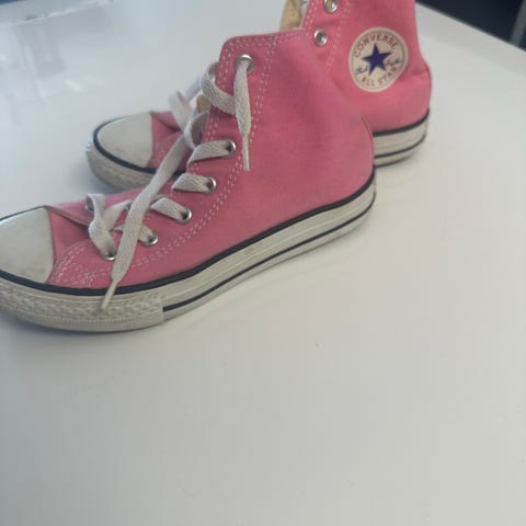 Lite og pent brukte sko, bare litt misfarging på det hvite på sålene og snører (det ene burde nok skiftes ut). Ingen slitasje under skoene. Lite stor på størrelsen.