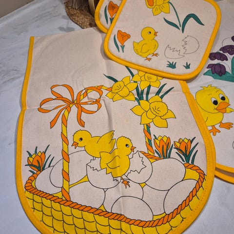 Nydelige påskegrytekluter med koselig kyllingmotiv litt retro stil. 17x17cm