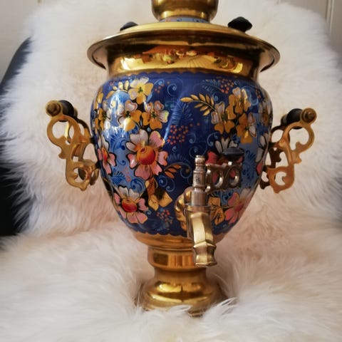 Russisk samovar. Volum 3 liter. Lagt av messing. Stempel sier at produksjonsår er 1992. Det finns en ubetydelig liten skade for lokket , som du kan se på en av bildene, en bit av malingen kom av og jeg reparerte den meg tusj, men bedre jobb kan gjøres med svart oljemaling.