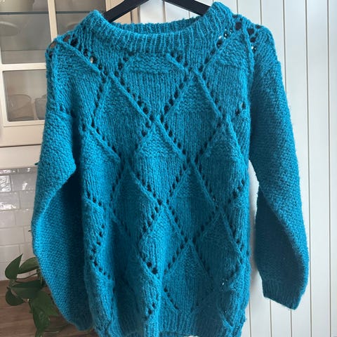 Det er med tungt hjerte jeg selger denne genseren jeg strikket for noen år tilbake. Jeg bruker den alt for sjeldent, så den fortjener et mye bedre hjem. Genseren er strikket i 100% alpakkagarn fra Sandnes, og er av mønsteret Løvrankegenser. Halsen er en klassisk boatneck. Grønnfargen er mest som på de to første bildene, og det siste er for å vise mønsteret på framsiden. Kan hentes på Carl Berner eller OsloMet eller sendes mot at kjøper betaler frakt 🌻