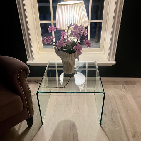 Selger et stilrent og moderne salongbord i høyglans hvitt med sølvfarget base, grunnet flytting. (Kjøpt 2019). Bordet har et elegant design som passer godt inn i både klassiske og moderne interiører.