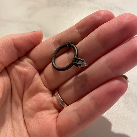 Kjedet har to ulike utforminger fra anhenget og mot låsen, to litt finere kjeder på den ene siden, litt grovere ledd med sirkel-forbindelser på den andre siden. To større og et knippe små sorte onyks-stener og en i rutilkvartz er festet i kjedet. Buret med sangfuglen inni er fastmontert i kjedet. Alt utført i oksidert sølv, passer både en kul casual stil, litt røffere antrekk eller som goth eller steampunk stil. Kan også brukes på et helt nøytralt antrekk uten noe «tema».