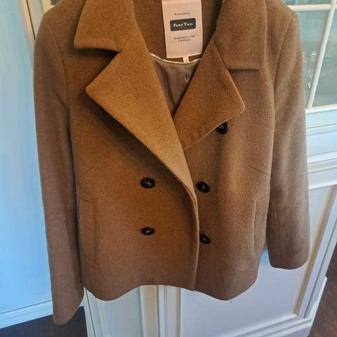 Lang lys brun strikket vest i merket co'couture. Knyting i sidene. Kan knytes på forskjellige måter. Den måler 97cm lang målt midt bak. Mål på stoff over skuldre er ca 50 cm. Denne passer i mange str. Men det står str m i den. Den har blit brukt kanskje 2 ganger maks.