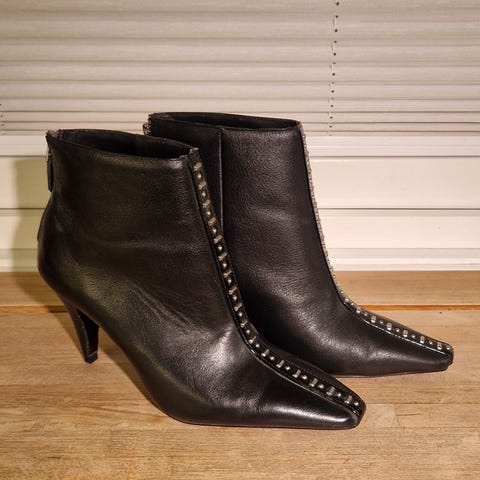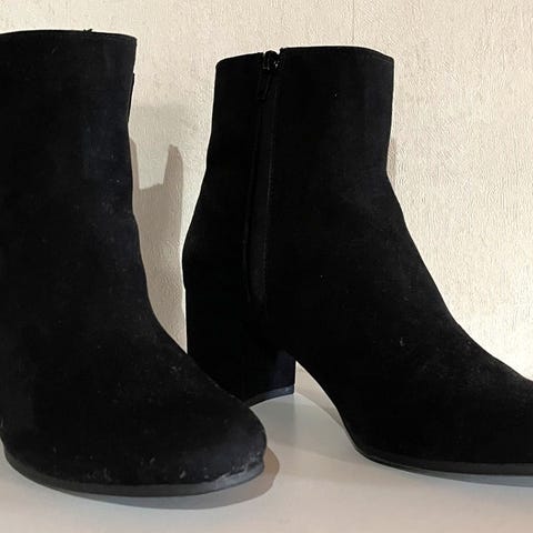 De er laget i et mykt, skinnlignende materiale som former seg fint etter ankelen. Den solide blokkhælen gjør dem både stilige og komfortable nok til å gå med hele dagen.