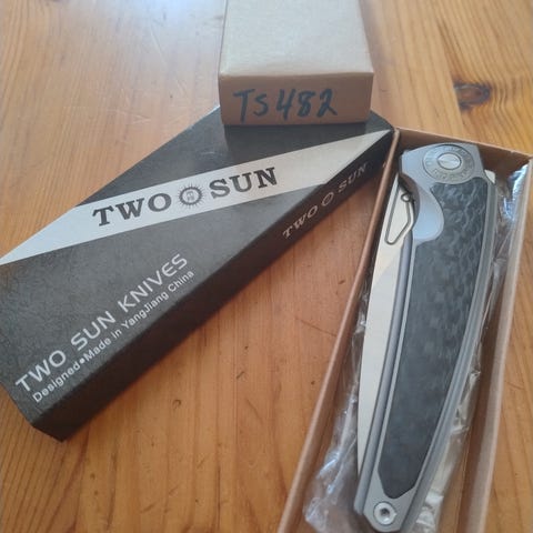 Twosun Ts483 full anodizert titanium var en limited sprint run Av ts483. har kun blitt brukt til å frigjøre andre kniver fra plast folie fengselet sitt. Er som ny, Designer er Tili Zator