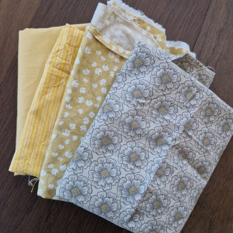 Fargen på stoffet er mer gult enn på bildet.