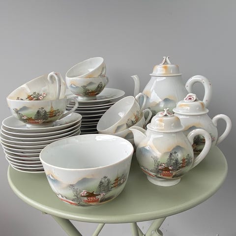 Japansk handmåla te-servise i porselen - 29 deler + eitt serveringsfat som ikkje er handmåla.
