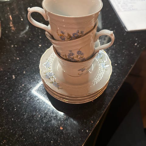 Seks små asjettter, seks tefat, seks tekoppar og åtte eggeglas og ein bolle/serveringsfat.