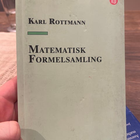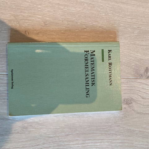 "Matematisk Formelsamling" av Karl Rottmann. Tror kanskje noe av omslaget har skiftet farge grunnet sollys, men innholdet later ikke til å være påvirket. Kan hentes eller sendes.