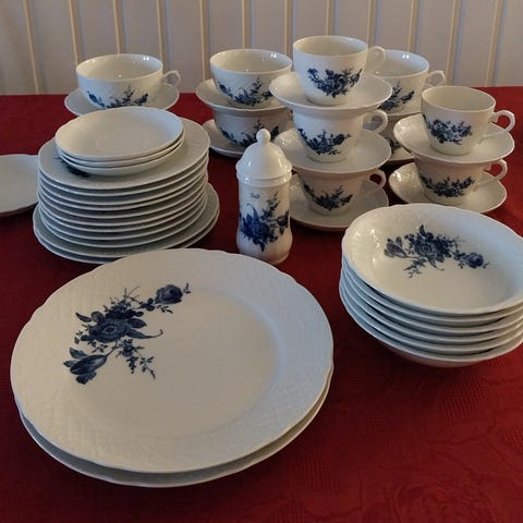 Nydelig servise i hvit, blå og gullfarget detaljer selges for 3000kr pga flytting