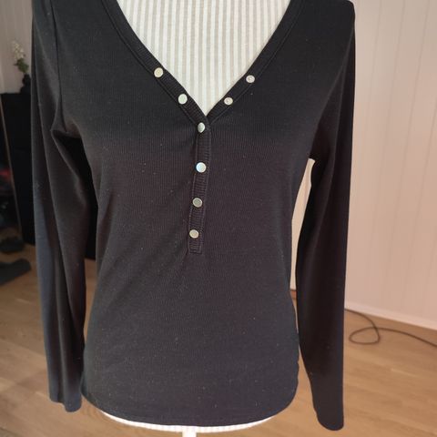 Selger helt ny svart topp med 3/4-ermer og med paljetter på V-halsen fra BPC for 100 kr.