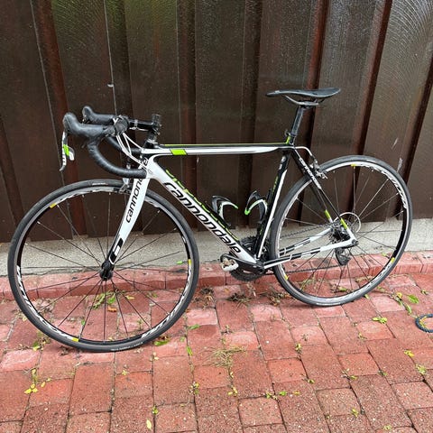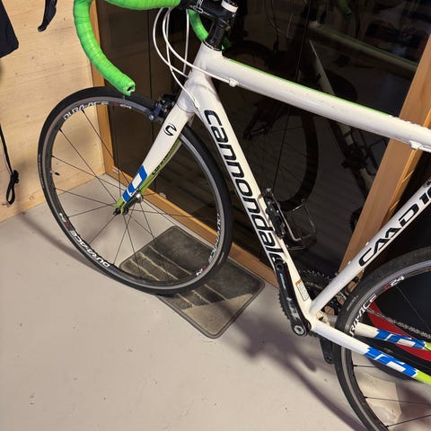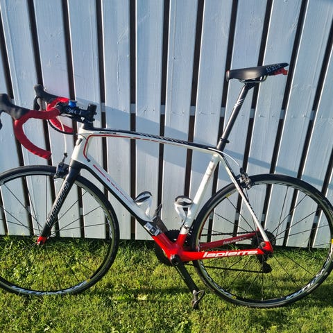 Sykkelen har karbonramme, karbonkrank og uti fra hva jeg kan se så er den utsyrt med ultegra på gir og brems.
