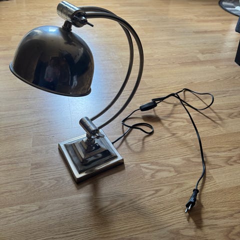 Fløt justerbar bordlampe med grønt hard glass og lyspære.
