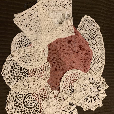 Håndarbeid / håndheklet / heklede duker / heklet duk / heklet rund duk / heklet brikke / retro duk / håndlaget duk / hvit heklet duk / heklet løper / heklet oval duk