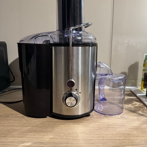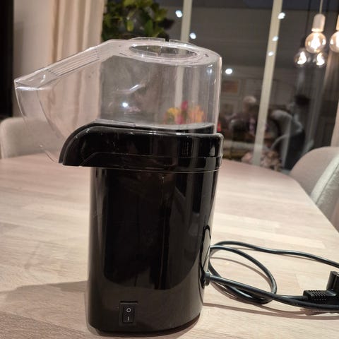 Menuett popcornmaskin med svart plastkropp og gjennomsiktig lokk. Egnet for tilberedning av popcorn til hjemmebruk.
