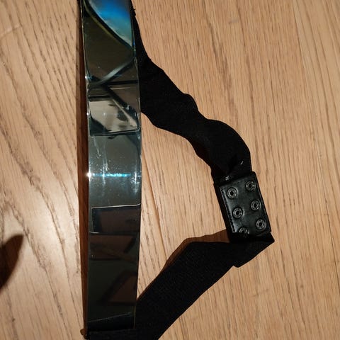 Beltet er i flettet metall med innfelte stoffbiter.