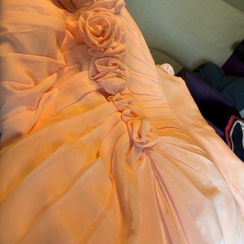Kjolen er i farge fersken og av merket Agape. Brukt i et bryllup og helt uten merker,den ser helt ny ut. Inni står det str. 48 men jeg var str. 44 da jeg brukte den. Da var den tett snoret bak. Snøringen bak gjør at kjolen spenner over flere størrelser. Kjolen har tre lag med stoff og den har god passform.