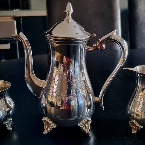 Nydelig lute kaffesett (til fløte og sukker) i 60 g sølvplettIngen skader, veldig lite brukt! Høyde på muggen er 7 cm!