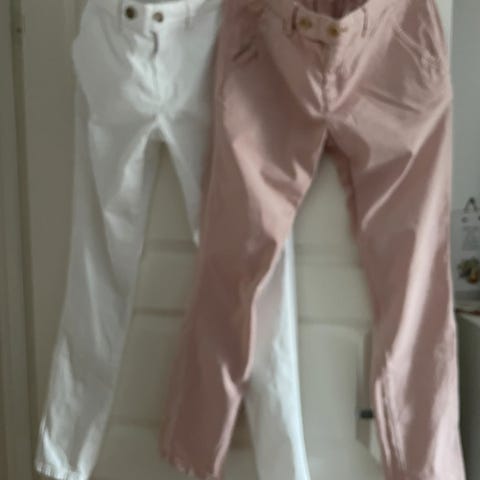 En rosa og en lyseblå bomullsbukse med elastan selges samlet for annonsert pris. Veldig behagelig på, god stretch, og god vidde i bena, behagelig linning med glidelås, knapp og beltestropper. Den rosa er lite brukt, den lyseblå er godt brukt med brukstegn ( nupper ).