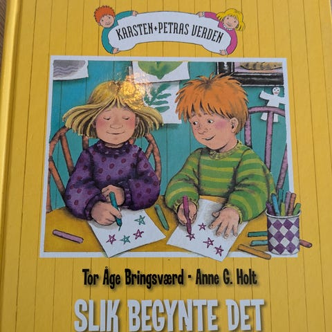 Her blir vi kjent med dem, og vi får høre hvordan de møttes for første gang. Forord av Tor Åge Bringsværd. De første bøkene om Karsten og Petra kom i 1992. Det er blitt en hel bokserie om de to barnehagebarna. Mange barn kjenner Karsten og Petra, også på grunn av filmene som er laget om dem og kosedyrene deres.
