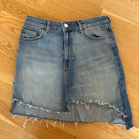 Kjole fra Never Denim i str XS. Tjukt, nesten ribbestrikket, stoff med rysjer nederst og på ermer.