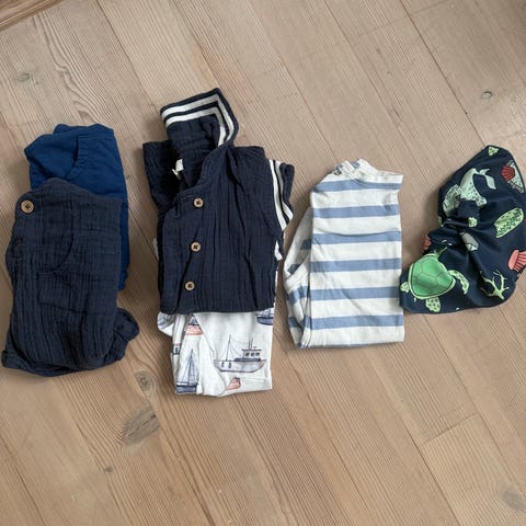 Tøyet er i Str. 86/92. Seleshortsen er i Str. 86 og begge overdelene er i Str. 92. Jeg syntes overdelene er små i Str. og passer best som en Str. 86 ☺️