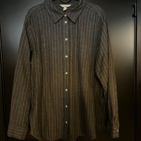 Gråbeige flanellskjorte med karamellfargede smale striper, nydelig kvalitet flanell med 95% bomull og 5% cashmere. Skjorten er rett og litt lang i fasong, str 36. Ingen flekker eller skjolder. Kan også sende direkte mot betaling på Vipps.