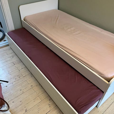 Sengen er demontert og er veldig enkel å montere (8 skruer og plankene må på plass). Den er ikke tung i sine individuelle deler. Men gavlene er store så det er kanskje ikke sikkert de går lett inn i en bil. 115 og 91 cm høye og 98 brede.
