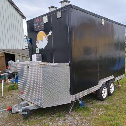 Vogna er gjort om fra campingvogn til foodtruck. Den har skilt nummer: DL 4708.