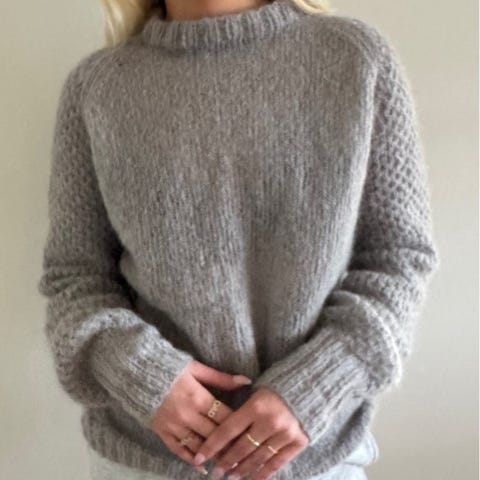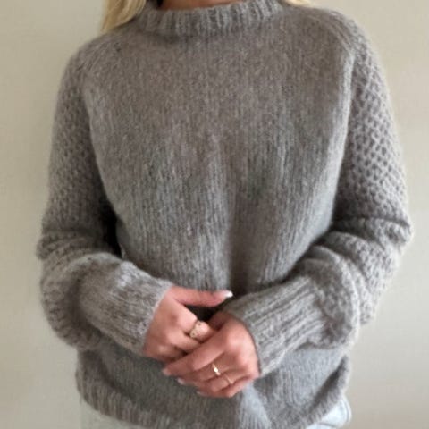 Selger en helt ny og ubrukt strikkegenser. Design: Røskva Sweater av Tanja Skovgaard Nielsen. Garn: Gepard garn My Soft One (frg 324) + Kid Seta (frg 409). Garnverdi: 1600kr.