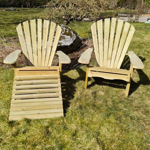 Gjør hagen, terrassen eller hytta klar for late dager med solide og komfortable adirondack-stoler. Disse stolene er designet for avslapning – med et bredt, ergonomisk formet sete (55 cm), buet rygg og avrundede armlener som gir både stil og komfort. Stolene er laget av trykkimpregnerte trevirke, og rustfrie skruer og bolter.