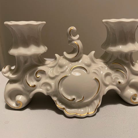 Dessverre har den en skade. Det er avskaling i den ene enden. Avskalingen under, er ikke mye synlig når den står på bordet, men det er to avskalinger på hver side som er synlige. Litt maling eller tusk kan nok forbedre dette. Selges derfor rimelig.