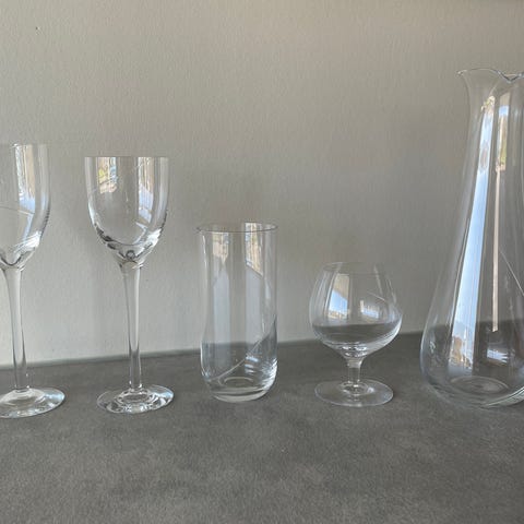 4 av glassene er Kosta Boda Chateau Beer og de 2 andre er Kosta Boda Line, men er svært like