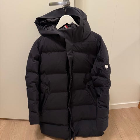 Lun og varm dunparkas. Jakken har brede tapede sømløse tuneller og har detaljer som innvendig ribmansjett på ermene og innvendig nakkehempe. Kåpen er en rett modell med hette og har to innerlommer. Liten metallbadge på venstre erm.