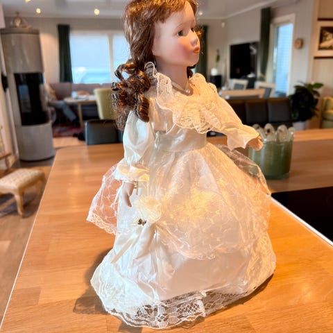 Dukken heter Margrete og er kjøpt på tidlig 90-tallet. Dukken har kun stått til pynt.