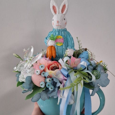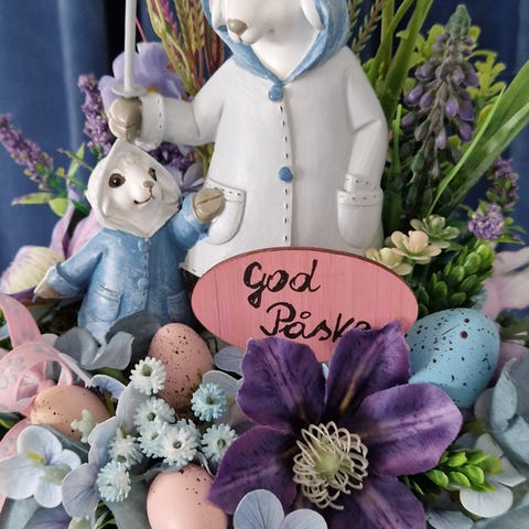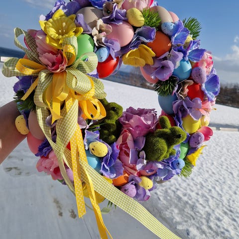 En vakker, fargerik, stor krans med en diameter på 40 cm kan henge på døren hele året. Alt er laget av kunstige blomster.