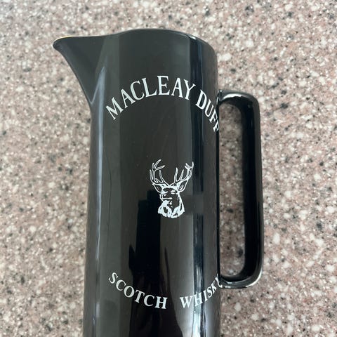 Meget pen whiskymugge med reklame for Dunhill. Høyde ca 17 cm, bredde ca 8, lengde ca 10 cm + hank. Ingen skader.