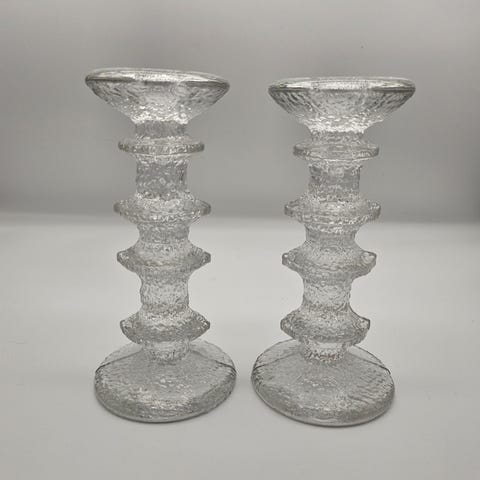 To meget pene Magnor Iris lysestaker i glass. Frostet stett. Høyde ca 21 cm. Sjeldne. Pris for begge.