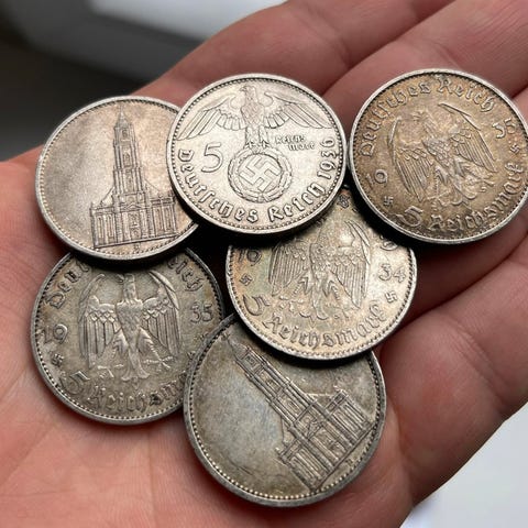 Mange av de ble smeltet ned etter krigen pa grunn av sølv. Mynten viser presidenten for Weimarrepublikken og Det tredje riket, Paul von Hindenburg.