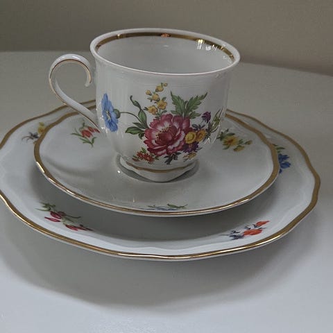 Porsgrund porselen til fire personer selges samlet for 245 kroner (kopp: høyde 7,2 cm / diameter 7,5 cm. Skål/asjett: diameter 13,5 cm / 17,5 cm. Pent behandlet). K26. Fraktkostnader: PostNord - 69 kroner. Betaling via vipps.