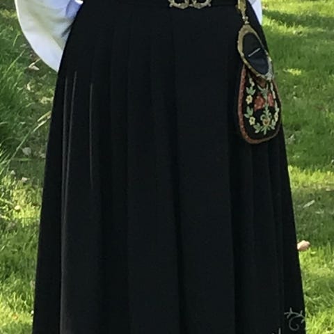 Stakk, skjorte, belte,kyse, pannebånd veske, sjal og sølv (2 søljer, veskelås, kjede, beltespenne, mansjetter, maljesett).