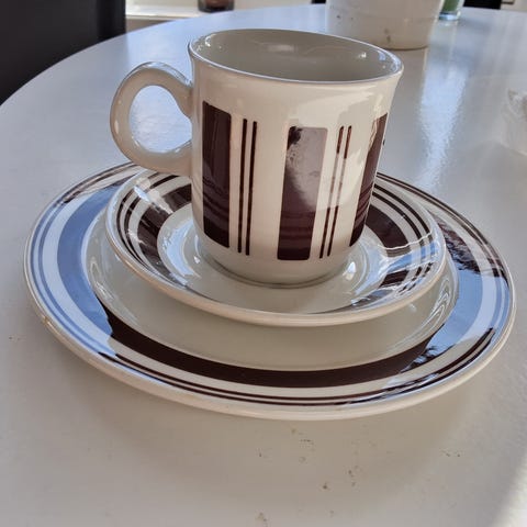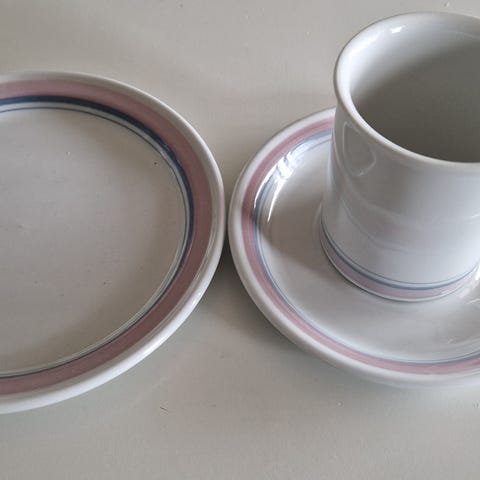 Kaffeservise til syv personer fra Porsgrund porselen selges for 375 kroner (kopp: høyde 7,1 cm / diameter 7,3 cm. Skål/asjett: diameter 13,9 cm / 17,4 cm). K26. Fraktkostnader: PostNord - 129 kroner. Betaling via vipps.
