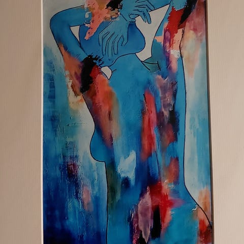 Elegant og tidløst kunstverk (50 x 75 cm) malt med akryl på lerret. Motivet viser en stilisert kvinne med martiniglass i rolige, dempede farger som passer perfekt i moderne og skandinaviske interiør. Signert av kunstner, originalt og ikke trykk. Leveres ferdig innrammet i pen treramme.