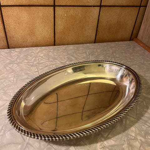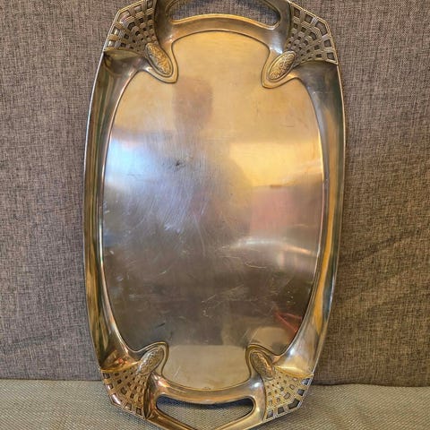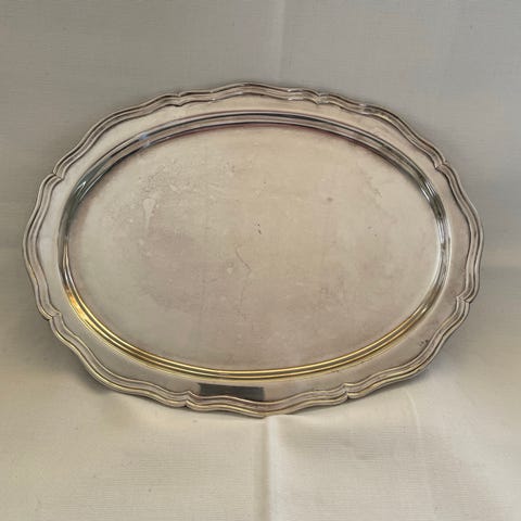 Ovalt pent serveringsfat i sølvplett. Noe patina.